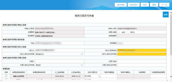 (2)填写申请信息。在“税务行政许可申请”填写页面中,按照表单要求填写相关信息以及勾选需要延期申报的税种以及填写申请延期申报期限等信息。